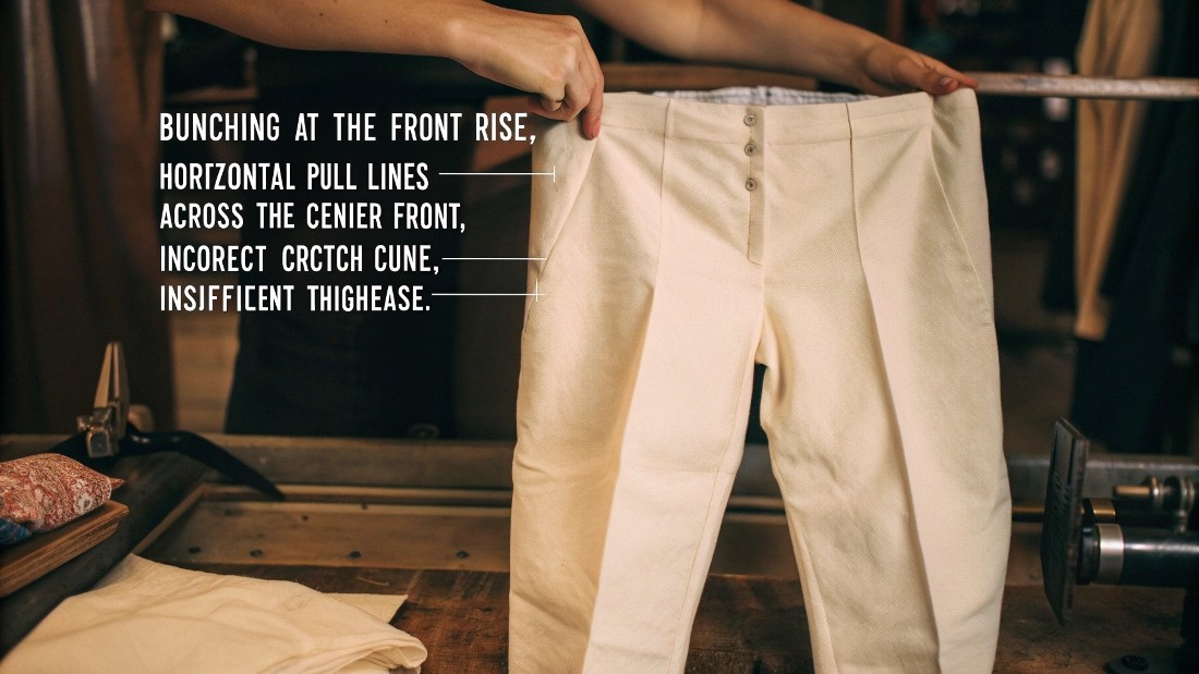 Look for bunching at the front rise, horizontal pull lines across the center front, sagging behind the crotch (“droopy bloomers”), or thigh constriction. These signs often indicate an incorrect crotch curve, incorrect seat fullness, or insufficient thigh ease. Early detection in a muslin prototype saves expensive fabric and production time.