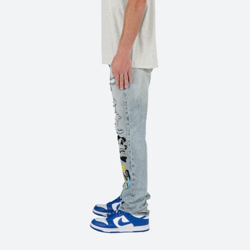 Premium denim showcasing punk rock artwork, custom portraits, and skull graphics. Features vintage light wash and artistic distressing. Perfect for alternative fashion enthusiasts and streetwear collectors